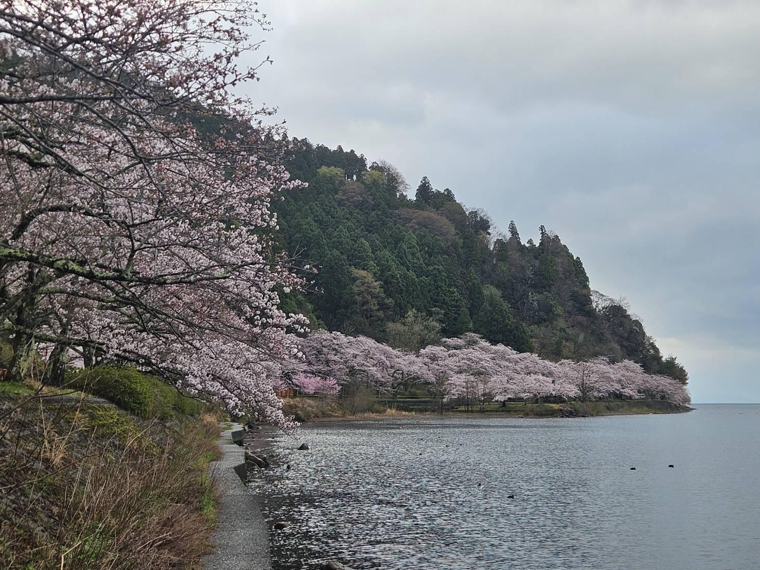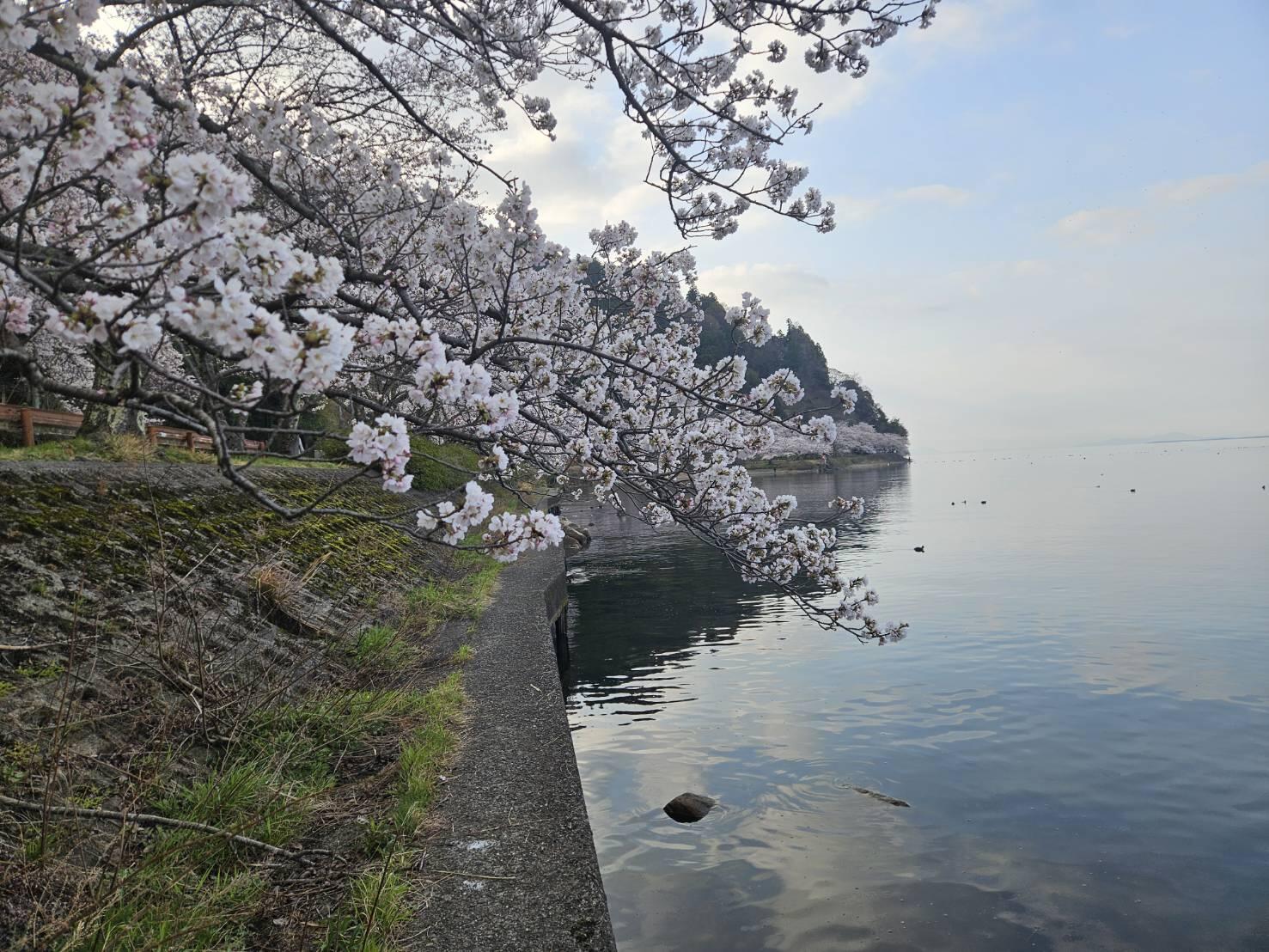 「日本のさくら名所100選」にも選ばれている海津大崎の桜。樹齢80年を優に超える老桜から次世代へ引き継ぐ若木まで約800本の華麗なソメイヨシノがびわ湖岸約4kmにわたり続きます。近年見頃は4月上旬頃(気候等により前後します)となり、近畿圏では遅咲きの桜名所として知られています。また、海津大崎は、琵琶湖八景「暁霧・海津大崎の岩礁」としても知られる景勝地で、びわ湖随一の岩礁と、湖の碧、遠くに望む竹生島、その景色の絶妙なコントラストは何度見ても美しく、毎年多くの花見客で賑わいます。この美しい景観を後世に継承していくため、地元「美しいマキノ・桜守の会」が中心となり保全活動にも取り組んでいます。